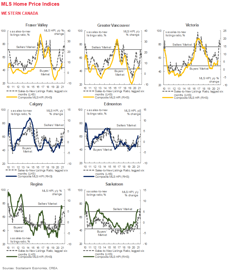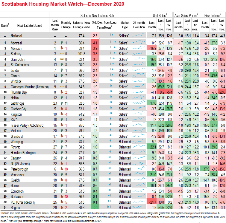 The December data cap off a remarkable year for Canadian housing markets. National-level sales and listings witnessed record plunges in excess of 50% (sa m/m) at the height of first wave lockdowns in April—on the heels of declines over 10% (sa m/m) in March as containment measures came into effect. At that time, we appeared headed for an unprecedented annual drop. Since then, a broad-based rally in real estate transactions activity has culminated in the strongest national-level annual percentage increase in home purchases since 2001! Twenty-five of the 31 cities we monitor witnessed annual sales gains in excess of 5%, and 28 recouped March–April losses in three or fewer months.