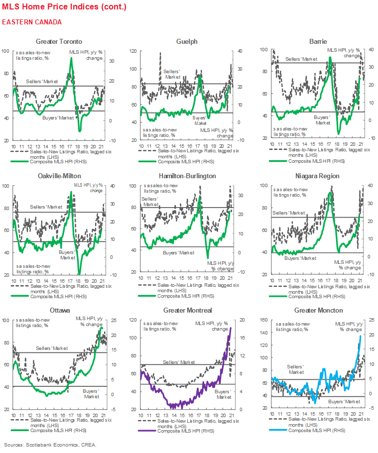 With new restrictions now in place across the country to combat second waves, slowing real estate transactions and price gains may be in store in the next few months. Our economic outlook released this week incorporates more stringent lockdowns and diminished economic activity in the first half of this year, though we do not foresee a repeat of the cratered economic activity witnessed in the spring. The delay of some activity into H2-2021, when we had already expected widespread inoculation to lift economic growth, likely means stronger second-half activity than we previously anticipated. Rock-bottom interest rates, ongoing federal and provincial fiscal supports, and the current supply-demand tightness should also contribute to home price gains over the medium-term.