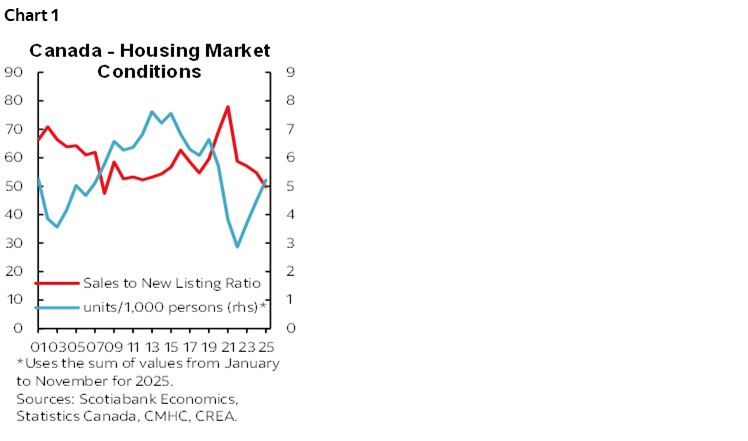 As a result, housing resale activity started 2025 showing monthly declines through March. Housing resales recovered in subsequent months to August but went back to their downward path after. National unit sales have ended 2025 below their December 2024 level as reported above. As a result, national housing market conditions eased in 2025 as reflected by the decline in the sales-to-new listing mentioned above and with the rise—as mentioned in previous reports—in recently completed and unabsorbed dwellings (per capita; chart 1 on page 1).