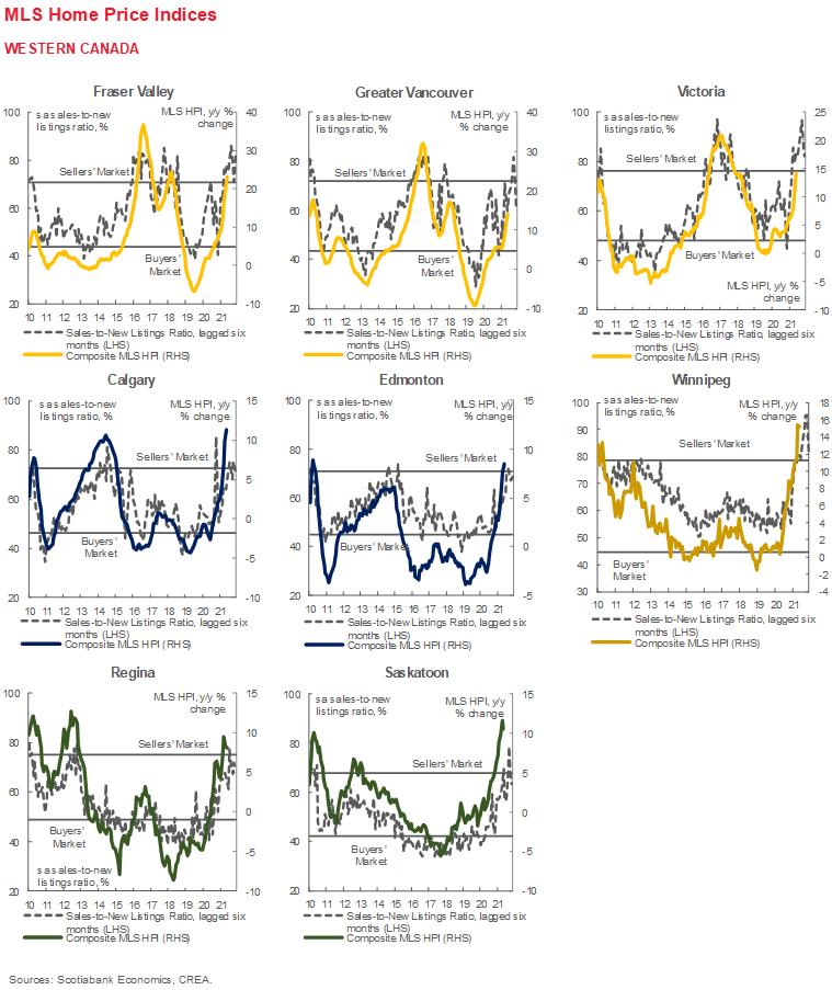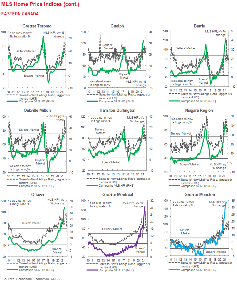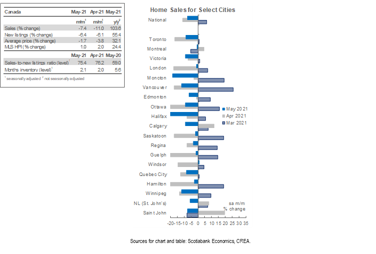 Canadian home sales declined by 7.4% (sa m/m) in May for a second drop in a row. Listings followed suit, falling by 6.4% (sa m/m). With sales falling by 1 percentage point more than listings, the national-level sales-to-new listings declined to 75.4% from 76.2% in April—a welcome moderation from record high readings earlier this year (the highest being 91% in January). Despite this easing, supply-demand conditions remain historically tight as this ratio is still significantly higher than its long-term average of 54.5%, and its May 2020 level of 59%. As a result of this persistent tightness in the housing market, we do not see prices reflecting the decline in sales, where the composite MLS Home Price Index (HPI) rose by 1% (sa m/m). This price increase, however, does reflect a deceleration in price gains compared to the unsustainable pace observed earlier this year, with February and March witnessing the biggest monthly price gains since 2000. This deceleration is in the most part driven by the single-family homes and townhouses segments, which experienced only half of April’s monthly price gain in May. Apartments, on the other hand, have maintained momentum in May.