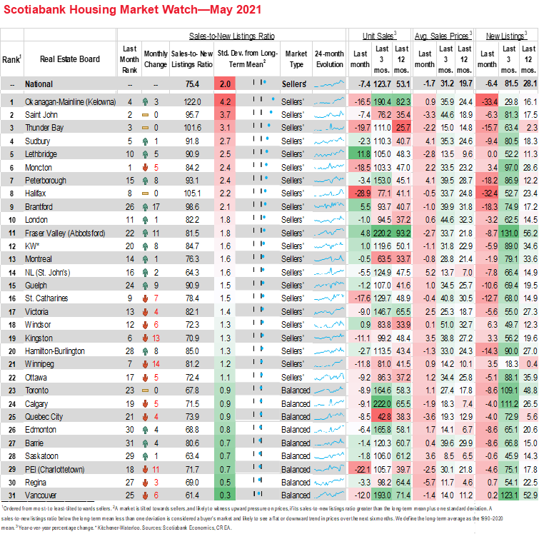A softening in the housing market for the second consecutive month this year has been felt across sales, listings, and price gains across much of the country’s markets. Despite the slowdown, however, the housing market remains historically strong. The reasons sales slowed down in May are not entirely clear, but it could well be related to the third wave, where much of the country was under lockdown in May, and the erosion in affordability after months of unsustainable price increases and persistent shortages in supply. The simultaneous drop in sales and listings for two consecutive months further points to this being more than just a demand-side story. The drop in listings serves to only limit buyers’ options, in a market that has already been in sellers’ territory. While potential sellers may be encouraged to list their homes to capture peak price gains as signs of moderation arise, another mechanic might be at play. Potential sellers might be hesitant to list their homes having been hearing the horror stories of too many buyers and bidders chasing too few homes and homes selling for hundreds of thousands over asking price. Why sell your house if you can’t afford to buy another? This may be particularly true in today’s rough bidding environment where the fewer conditions on an offer, the better—whereas it used to be acceptable to include a clause in your offer that indicates you would buy the home as long as you can sell yours, clause-inclusive offers are not considered the most competitive today.