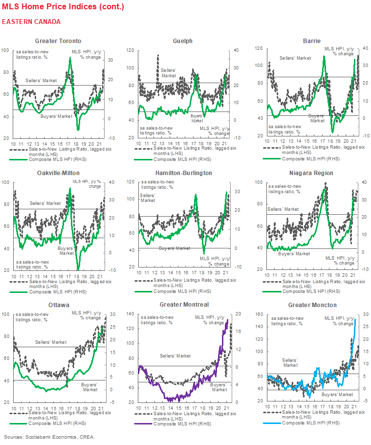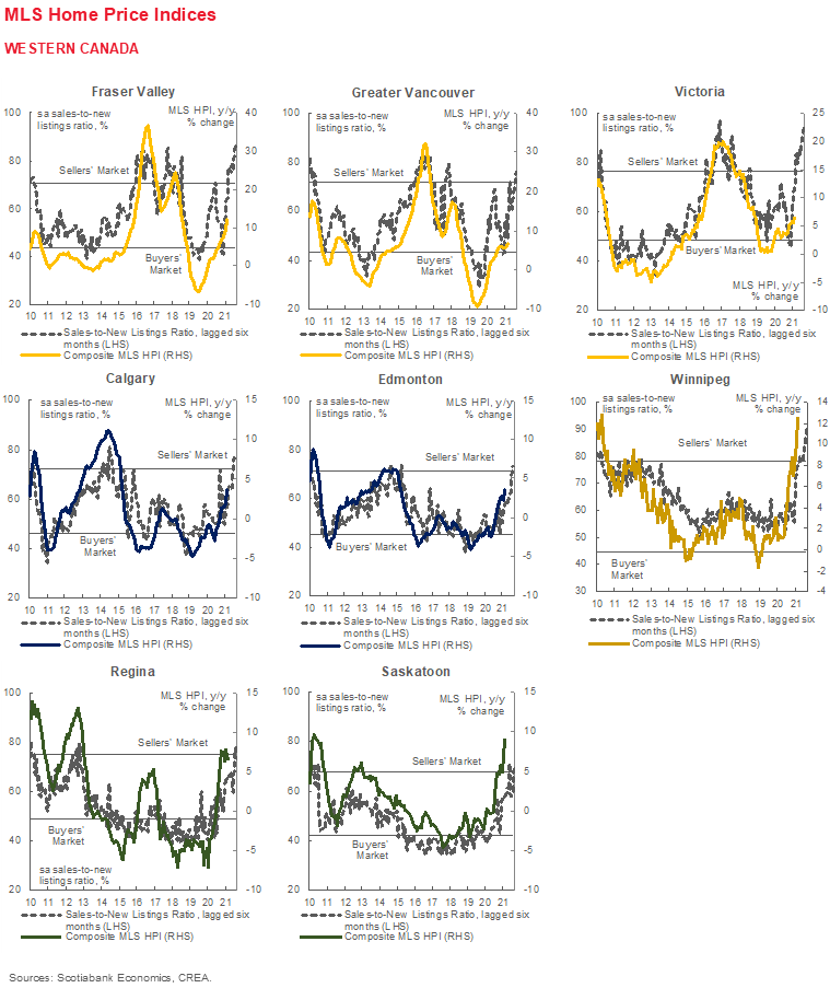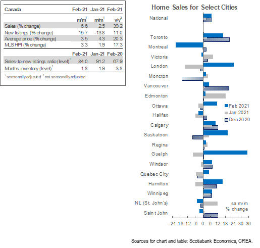 February saw Canadian home sales rise by 6.6% (sa m/m) while listings rebounded by 15.7% (sa m/m). This month’s increase in sales sets yet again another record, but it is accompanied by a welcome increase in listings. The national-level sales-to-new listings fell to 84% from the record reading of 91% in January in which all the markets we track recorded their highest ratio on record. The composite MLS Home Price Index (HPI) rose 3.3% (sa m/m), reflecting the sharp increase the sales-to-listing ratio seen in recent months. Two-storey single-family homes continue to be the main driver of this price appreciation, while apartment prices remain relatively close to pre-pandemic levels.