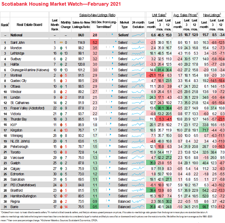 Sales gains continued to be broad-based and felt across much of the country relative to a year ago. The very few markets that experienced a decline from last year were areas with extremely limited supply. Of the 31 local markets we monitor, 30 witnessed sales gains this month compared to February 2020. The exception is Montreal. Compared to January 2021, 25 markets witnessed sales gains, driven mainly by Ontario regions, with Barrie, Guelph, and Brantford averaging almost 36% (sa m/m)—these more than offset the 21% (sa m/m) decline in Montreal.
