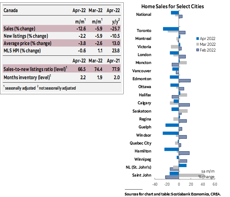 Canadian home sales fell by 12.6% (sa m/m) in April, while listings dropped 2.2% (sa m/m). The sharp decline in sales eased the sales-to-new listings ratio, an indicator of how tight the market is, to 66.5%, its lowest level since June 2020. This easing in conditions brought about a decline in the composite MLS Home Price Index (HPI), which edged down 0.6% (sa m/m) in April compared to March. This is the first monthly fall since April 2020. Most of the declines were seen in markets in Ontario, led by larger detached homes.