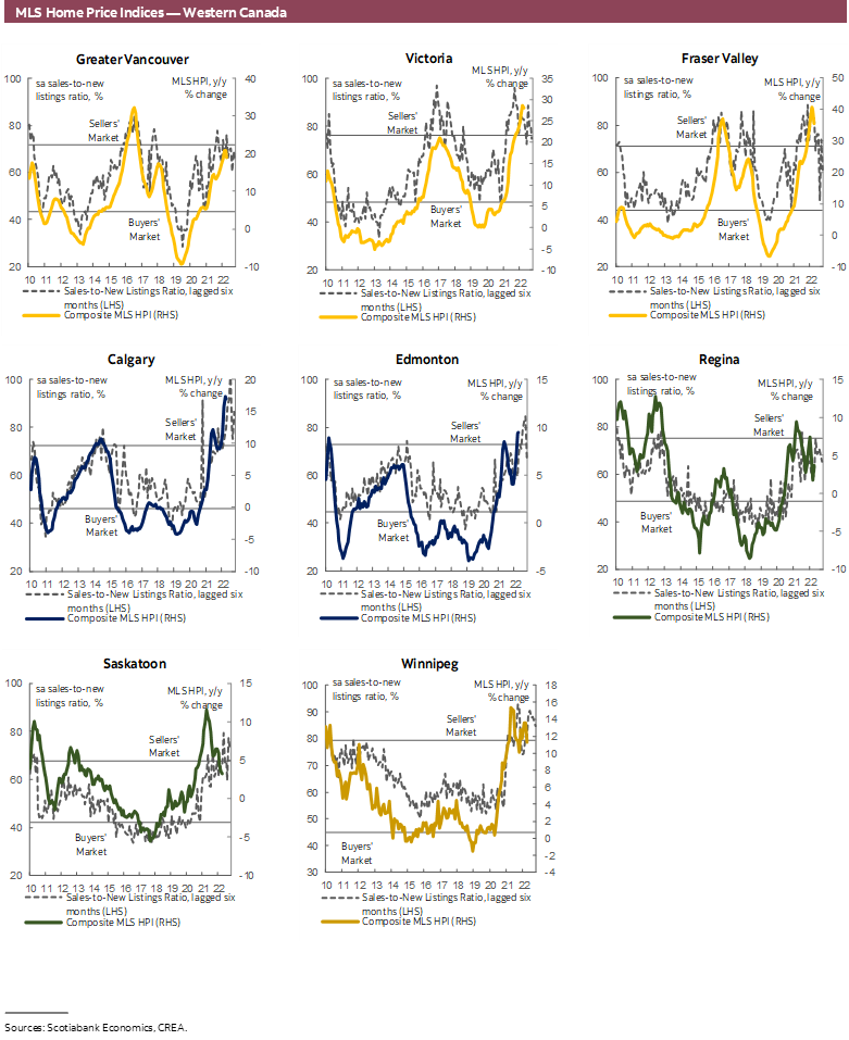All home-types registered monthly price declines in April, except for apartments, which still registered a small price gain. Two-storey family homes led the fall in prices (-1.6% sa m/m), followed by one-storey family homes (-1% sa m/m) and townhouses (-0.9% sa m/m). On the whole, the composite MLS HPI for all homes in Canada was 23.7% (nsa y/y) higher in April 2022 compared to the same month last year, a marked slowdown from the record setting year-over-year increase in February 2022 of 29%.