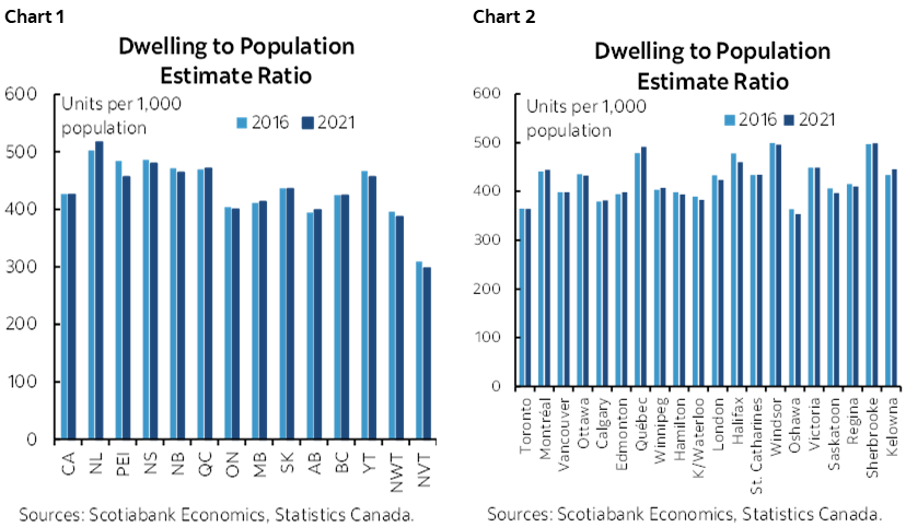 - Using Statistics Canada’s population estimates, and not the Census population counts, which undercount the number of residents by more than a million individuals, the ratio of homes to population fell during the 2016–21 period. This is true at the national level, as well as in most provinces and the majority of the 20 largest Census Metropolitan Areas.