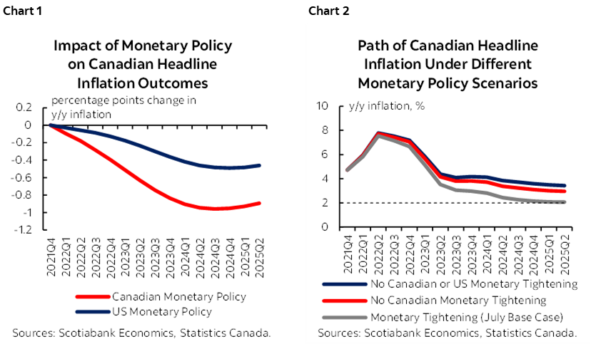 - Moreover, given how US inflation and growth dynamics impact Canada, we find rate hikes by the Federal Reserve have so far shaved an additional 0.2 percentage points from Canadian inflation, which will build through 2025 to account for about 0.5 percentage points.
