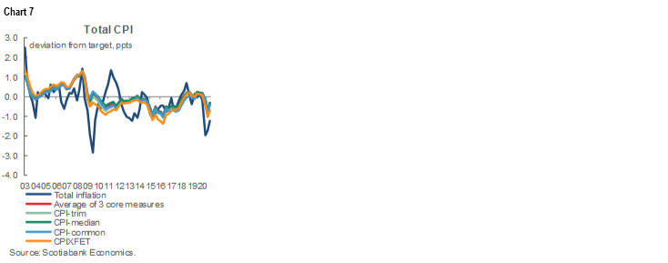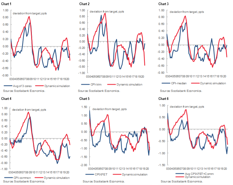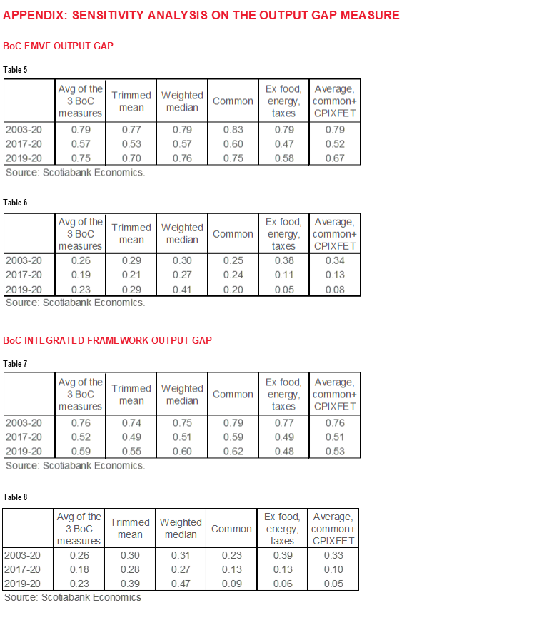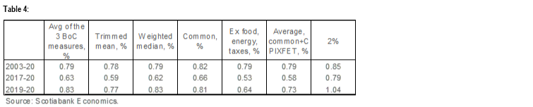 In terms of modelling, from now on in the Scotiabank Macroeconomic Model we will use CPIXFET to anchor the forecast of total CPI (combined with the price of oil and the output gap). We will also introduce the mean of the CPIXFET and the CPI-Common inflation rates in the reaction function of the Bank of Canada. Up until now we were using the average of the CPI-Common, CPI-Trim and CPI-Median inflation.