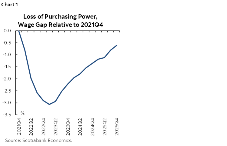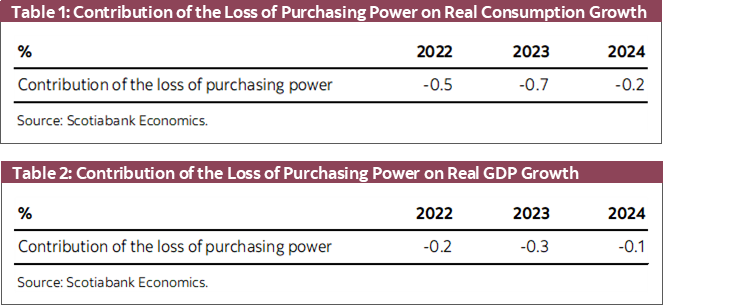 Recently, inflation has outpaced the growth of wages, leading to a loss of purchasing power. In a recent note, we estimate that household purchasing power will fall by 3% in the next year or two (see chart). We also forecast that wage growth will be catching up starting in 2023 to start to close this wage gap and eventually restore purchasing power by the end of 2025/beginning of 2026. Using the Scotiabank Global Macroeconomic Model, we find that the expected deterioration of purchasing power, through its effect on disposable income, will reduce GDP and consumption growth by a cumulative 0.6 percentage points and 1.4 percentage points, respectively, over the next three years. The biggest effect will be in 2023, reducing GDP growth by 0.3 percentage points.