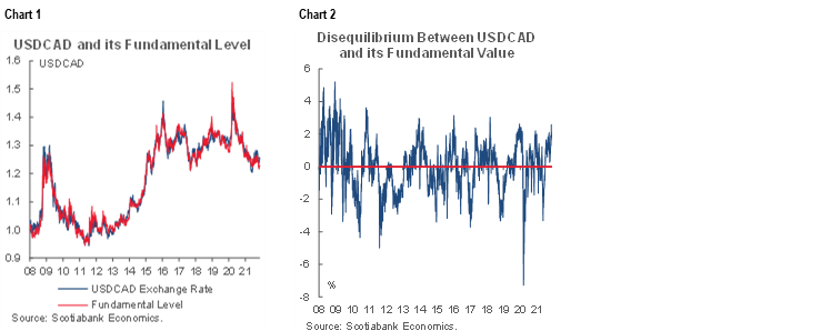 - Our latest estimates suggest that the USDCAD exchange rate is currently overvalued by around 2%, with the fundamental drivers suggesting a ‘fair value’ of 1.22 USD per CAD.