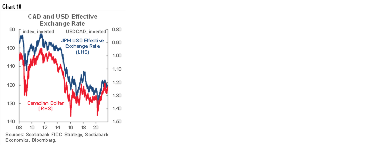 a) A broad dollar index (chart 10) is included to adjust for multilateral adjustments in the dollar that represent broad international economic or financial conditions that impact USD demand. Integration in global markets means that the CAD is relatively more sensitive to external rather than intrinsic drivers. If this variable is omitted, an alternative model suggests that the CAD is currently significantly under-valued (suggesting a USDCAD value of around 1.10).