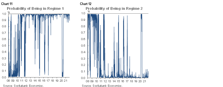 We estimate a regime-switching framework to identify periods in which the exchange rate’s response is driven by risk sentiment vs periods where the Canadian dollar is driven by more intrinsic fundamentals (charts 11 and 12).2 The risk-off periods are more greatly influenced by movements in the broad USD index and the VIX, whereas fundamental periods are driven mostly by oil and interest rates. According to the results, since the 08-09 financial crisis and its aftermath, the USDCAD has generally been in the latter regime, that is less impacted by risk sentiment.