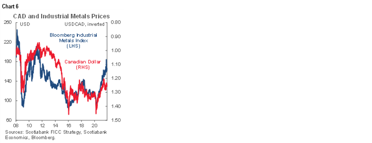 b) Bloomberg industrial metals index (chart 6). This weighted basket of copper, aluminum, zinc, and nickel is included given Canada’s trade surplus with the US in industrial metals, with a similar justification for the inclusion of crude oil prices.