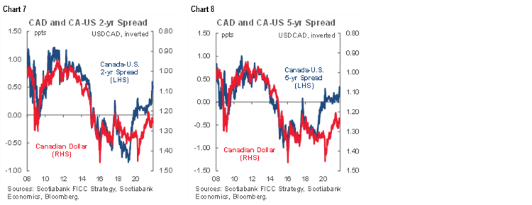 a) 2-year and 5-year Canada-US yield differentials (charts 7 and 8). Higher Canadian yields in relation to the US increase demand for CAD as investors seek higher returns in Canadian assets (all else equal). We include both the 2-yr and the 5-yr spreads to differentiate between shorter-term and longer-term investment horizons (note that 10-yr spreads are less statistically significant, in comparison). The former may act as a close reflection of near-term policy rate expectations while the latter points to expectations around how quickly the central banks will increase rates relative to each other. A specification that excludes either the 2- or the 5-year spread results in a weaker fit over our estimation horizon.