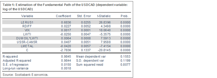 We use a cointegration approach to generate the daily fundamental path of the USDCAD. We tested many determinants of the CAD exchange rate available at the daily frequency. The final specification optimizes the fit of the model (i.e. all regressors are simultaneously statistically significant) and includes JP Morgan’s USD effective exchange rate index, the price of oil, metal prices, 2- and 5-years interest rate differentials and the VIX (see table 1).