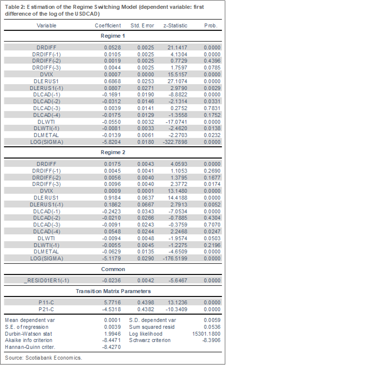 In the Markov Regime Switching Model we allow the USDCAD short-term elasticities to vary across two distinct regimes. Consequently, in the short term, the effect of the price of oil, metals prices, interest rates differentials, the US effective exchange rate, and the VIX on the USDCAD are different across the two regimes identified by the model. According to the results, all the drivers affect the USDCAD in both regimes with the same sign, but the magnitude of their effects differs from Regime 1 to Regime 2. The first regime is relatively more affected by oil prices and interest rate differentials and Regime 2 is relatively more affected by multilateral adjustments of the US dollar and market volatility as captured by the VIX. Note that we assume that the long run elasticities (i.e. the error correction term based on our fundamental path of the USDCAD) are the same across the two regimes.