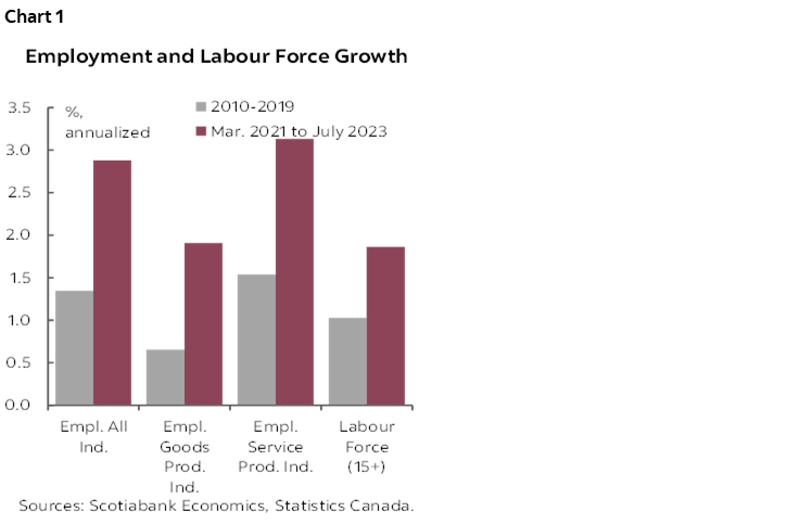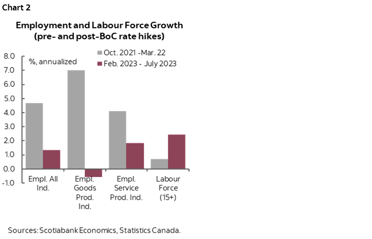 Despite the sharp hikes in the policy rate since March 2022 and the continued rise in real interest rates (as discussed in this note), the labour market has surprised on the upside with its resilience. Employment growth inevitably slowed—LFS employment grew by an annualized 1.3% in the last 6 months, down from 4.7% in the 6–month period to the Bank of Canada’s policy rate liftoff in March 2022 (chart 2). Employment growth in goods production plunged from the whopping 7% to a rate more consistent with its pre-pandemic average, before contracting sharply in July. Employment growth in the service sector also softened from over 4% before BoC’s liftoff to only slightly above its long-term average, despite of strong increases in the transport & warehousing industry likely boosted by healing supply chains. Labour supply improved notably thanks to booming immigration, providing some relief to the labour market tightness. However, it continues to remain constrained, as reflected by near historically low unemployment rate and the persistently elevated 4.3% job vacancy rate as of May 2023, well above the 2.8% average in the 5-year period preceding the pandemic (2015–2019). Demand for labour still exceeds supply.