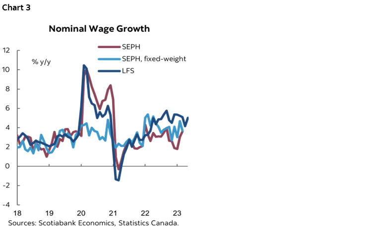 Tight labour market conditions beget robust nominal wage growth (chart 3). These conditions contributed to strengthen wage growth with firms bidding them up to attract and retain workers. They also provided workers with a strong bargaining position and the willingness to use it to recover their loss in purchasing power from the strong rise in consumer prices since March 2021. Nominal wage growth—as measured by both the average and median hourly wage rate from the Labour Force Survey (LFS)—grew at 2–3% y/y before the Bank of Canada’s policy rate liftoff in March 2022. Wage growth from both indicators trended up thereafter and peaked well above 5% in November 2022. It declined since but was still elevated in July, at 4% and 5% respectively for the median and average hourly wage. Annual wage inflation indicators tracked by the Survey of Employment, Payrolls and Hours (SEPH) have also strengthened during a similar period. They have generally been weaker than the LFS measures since July 2022—hovering within a 3% to 4% range.