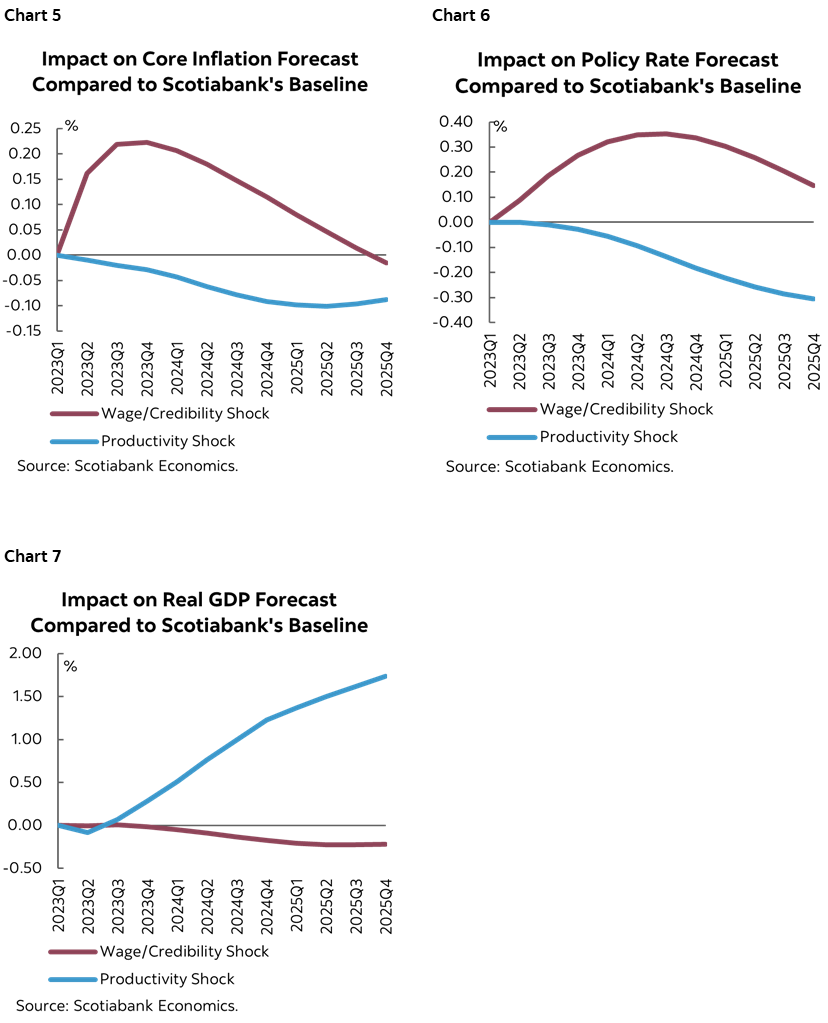 Wage growth needs to slow rapidly from current speed to bring down inflation. To illustrate the importance of slower wage growth for inflation, interest rates and economic outlook, we use our macroeconomic model to generate an alternative scenario in which workers have: 1) reduced confidence that the central bank will achieve a meaningful reduction in inflation by the end of 2024, and 2) a stronger desire to recover the loss in their purchasing power. In this scenario, the weight allocated to the inflation target by workers when forming their wage demand is reduced at the expense of a stronger weight on past—and more elevated—inflation figures, and their wage demand stays near recently observed annual pace of 5% in the next 12 months, rather than declining with the expected labour market cooling as in our baseline scenario. This scenario essentially assumes that the pick-up (to 4.1%) in the average annual percent wage adjustment for 2023Q2 wage settlements—from an about 2.5% average in second half of 2022—will continue over our forecast horizon.