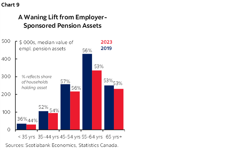 And the biggest relative gains in financial assets outside pensions accrued to younger households. Albeit from a lower base, the under-35 cohort saw a near-doubling in financial assets since 2019 (chart 8). Though micro data are pending, Statistics Canada observed that more young families are amassing wealth outside principal home ownership. The agency reported that 15% of those under 35 who rented their principal residence and had no employer pension plan had a net worth greater than $150 k. That share was just 5% in 2019.