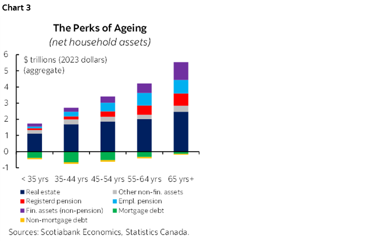 Canadian households have never been wealthier across the ages. Recall, there is an expected life cycle to wealth: a progressive accumulation in pre-retirement years before pivoting to decumulation in later years (chart 3). In 2023, the median net worth of young households (e.g., <35 yrs) stood at $159 k versus $873 k for pre-retirement households (e.g., 55–64 yrs), falling to $739 for senior households (e.g., 65+ yrs). In 2023, generations across the age curve saw step-changes in net worth after essentially no change between the 2016–2019 surveys (chart 1).