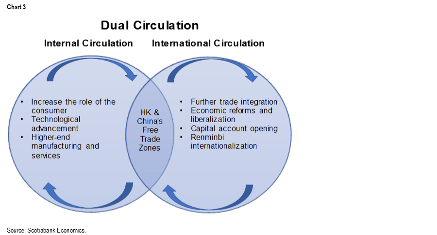 In our assessment, another key element of internal circulation is technological advancement that will be critical to move the country higher in the global value chain. China aspires to be a global technology powerhouse, underpinned by domestic innovation. Moreover, given various other countries’ concerns regarding China’s security and intellectual property practises and resultant restrictions on China’s access to technology resources, the country’s focus on internal technological capabilities, such as domestic production of semiconductors, will provide it with some protection from external tensions. Related to China’s technological aspirations is another core element of internal circulation—the country’s industrial strategy. China aims to strengthen and diversify its industrial supply chains and push for higher-end manufacturing. Simultaneously, the nation aims to further develop the services sector and support services-oriented manufacturing, thereby assisting the economy’s climb to a higher level of development that is more in line with major advanced economies.