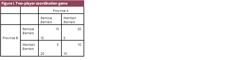 The purpose of this exercise is to illustrate the kind of coordination failures that can block reforms beneficial to both players—not realism. In this regard, the key conclusion is that absent some means of binding the other player to the cooperative outcome in which each removes barriers to inter-provincial trade, both players have an incentive to assume that the other will maintain their barriers to internal trade. As a result, the game reverts to the status quo with both provinces left worse off—in other words, money is left on the table.