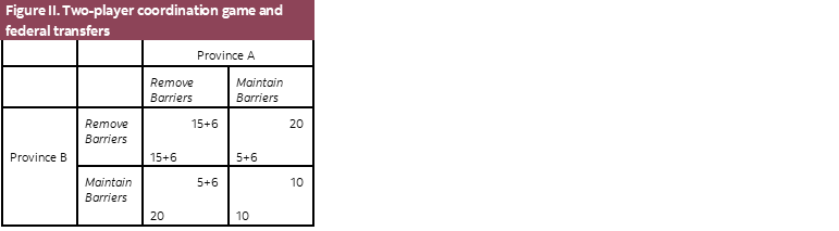 If the federal government had clear constitutional authority to prohibit non-tariff barriers to inter-provincial trade, or the provinces were to unanimously agree to a charter of economic rights, it could enforce a cooperative outcome to remove barriers in the game above. However, the Supreme Court ruling in respect of R v. Comeau does not provide that authority, while negotiations on a charter of economic rights would likely prove long, arduous, and possibly divisive. Our proposal to assuage coordination failures through federal transfers can be used to avoid these approaches and support internal trade liberalization. This scenario is shown in Figure II.