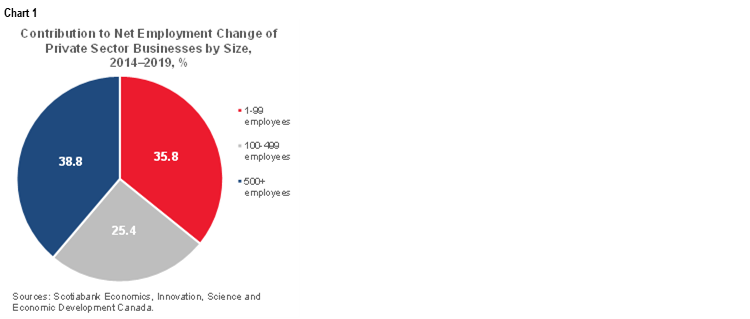 The Canadian economy has its share of business giants, from auto manufacturers (Magna International) to large integrated oil producers (Suncor Energy) to technology companies (Shopify). However, in many ways the story of the Canadian economy is written by small and medium-sized businesses (SMEs), which are ubiquitous across all industries and account for a very large portion of economic activity (see here). As of 2019 they accounted for almost 90% of the private sector employment and more than 99% of Canadian business establishments, contributed over 60% of the overall net increase in employment in the five years through 2019 and accounted for over 50% of the level of Canadian GDP.