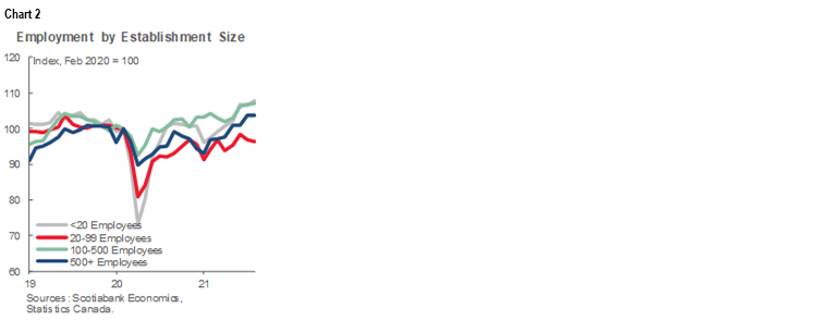 While SMEs have not yet recovered from the pandemic, with employment continuing to languish below the pre-pandemic levels particularly in the 20–99 employees category (chart 2 again), SMEs make up most of the employment gains since April 2020, with 75% of net job gains occurring at firms with fewer than 100 employees.