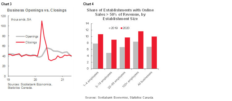 The numbers of business closures spiked, but once the restrictions started to be lifted new businesses sprang to life (chart 3). In part this speaks to the adaptability of the Canadian entrepreneurs and business owners, who pivoted to new technologies when restrictions disrupted existing ways of doing business. One example is an embrace of e-commerce, with the share of firms who obtain more than 50% of revenue from online sales rising for all business sizes between 2019 and 2020, although this also reflects the restrictions on in-person business during the pandemic (chart 4). The shift was more pronounced for firms with 5–99 employees, and is a particularly welcome development given that these strata were previously underutilizing this technology compared to the Canadian average. Given the rapid evolution of the way businesses operate in Canada, a new spurt of innovation may be coming and SMEs should stand to benefit the most.