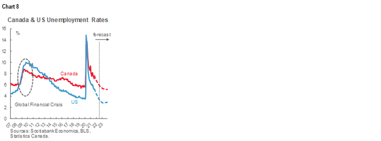 - Strong growth south of the border is expected to boost Canadian exports, adding to internal pent-up demand, leading to an acceleration in the second half of 2021 with the overall Canadian growth at 4.8% for the year, before a gradual slowing to 3.6% in 2022. Such strong growth is expected to leave the Canadian unemployment rate at a record-low level of 5.2% by the end of 2023 (chart 8).