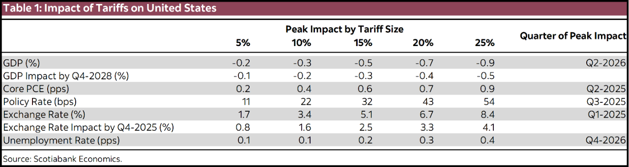 We report these rules of thumb as the peak effect on key variables in Canada and the U.S. in response to tariffs imposed permanently by the U.S. on Canada and Mexico—starting with 5% and going up in five percentage point increments up to 25%. While we do not expect the 25% tariffs will be implemented, these aim to provide useful estimates of the sensitivity of the U.S. and Canadian economies to different tariff levels. Please refer to tables 1 to 4 and accompanying text.