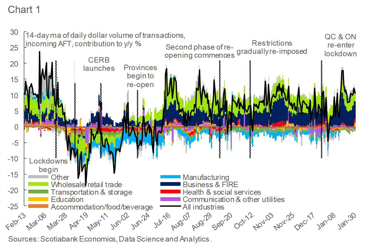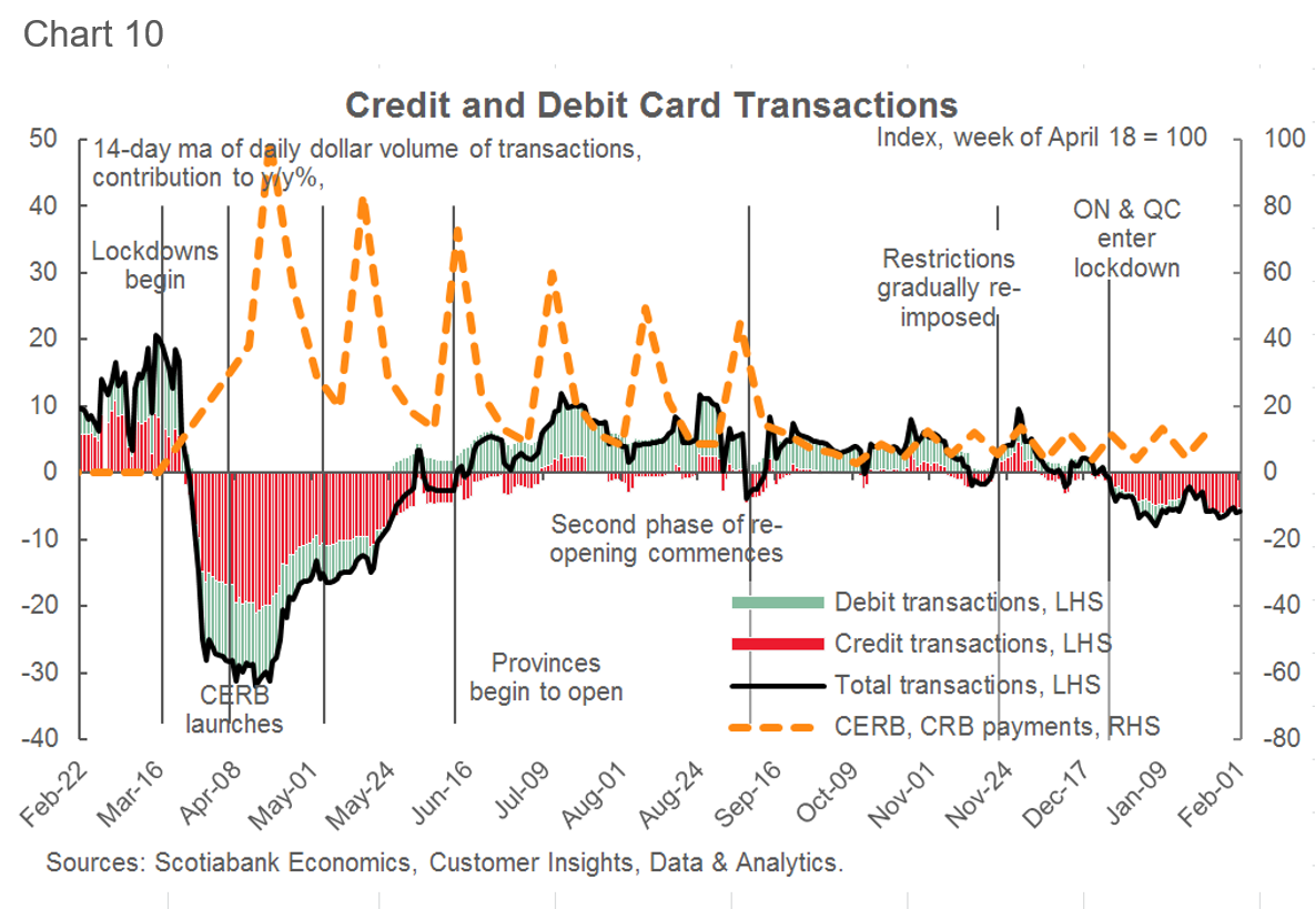 Growth in consumer card spending remained in negative territory for all of January (data to February 1st), as restrictions hit card spending following the implementation of lockdowns in several provinces (Chart 10).