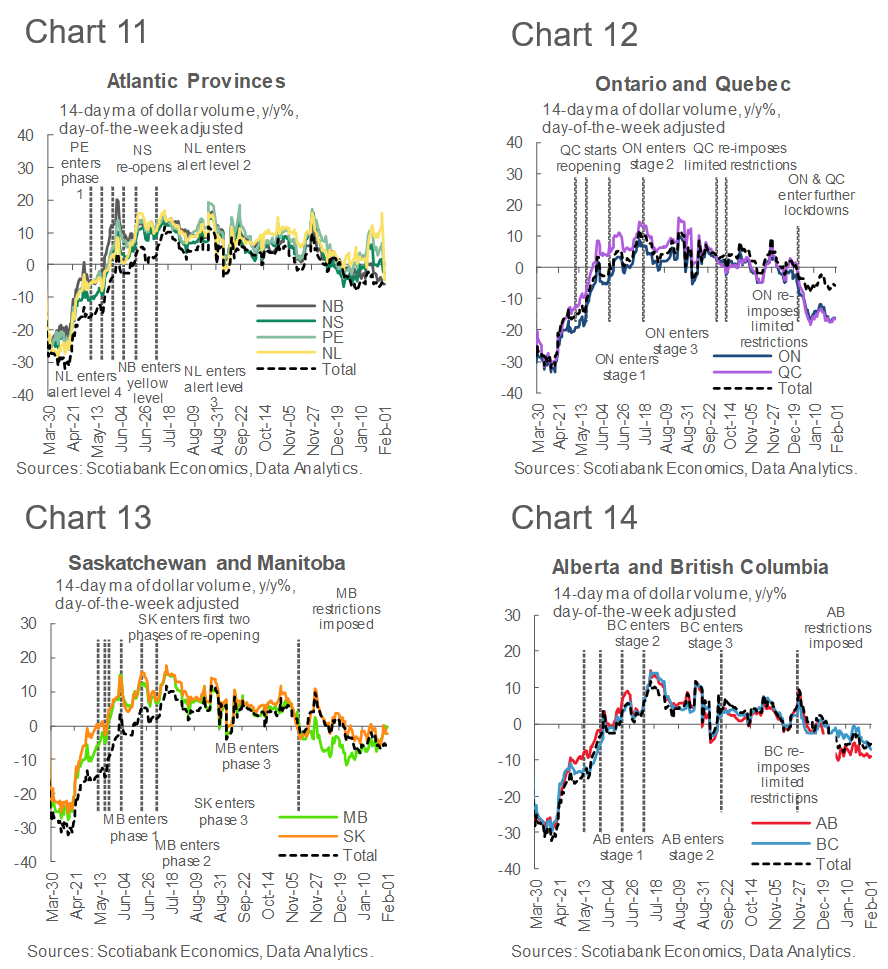 Provincial spending data is mixed, with volatile growth in Atlantic provinces that remained resilient for most of January, in contrast to Ontario, Quebec, and the Western provinces where spending remained weak relative to last year’s levels (Charts 11-14).