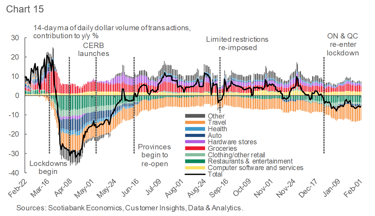 - Chart 15 shows that the slowdown in total purchases is driven mostly by weaker spending in the sectors that were at the epicentre of the most recent lockdowns, such as non-essential retail, restaurants, entertainment and travel.