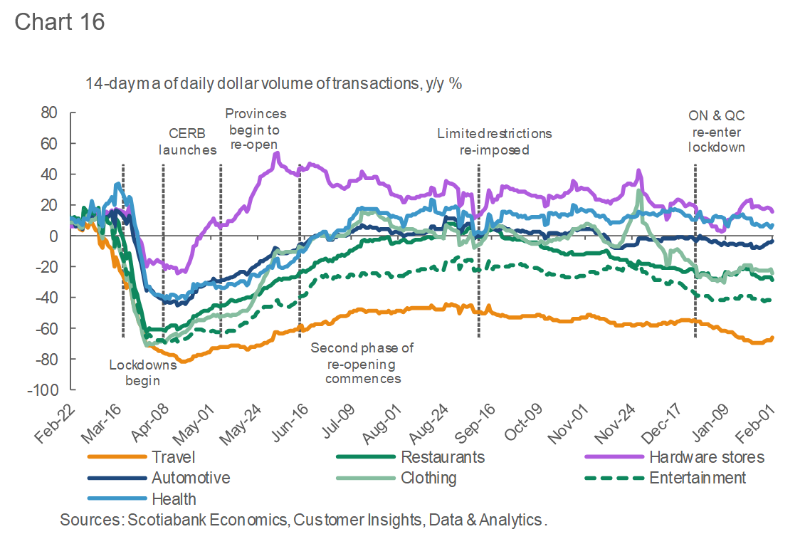 In contrast, hardware purchases expanded throughout January, a testament to continuing strength in home renovations as people spend more time at home, or prepare their houses for sale to take advantage of a very strong housing market (Chart 16).