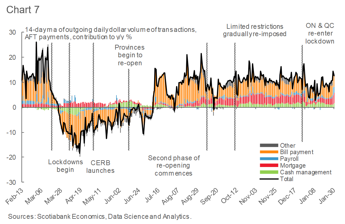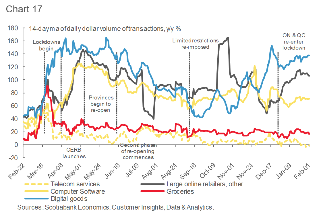- Growth in spending on digital products (music, movies, videogames) has risen further in January, while large online retailers saw a significant spike in purchases since the lockdowns were imposed in various provinces (Chart 17).