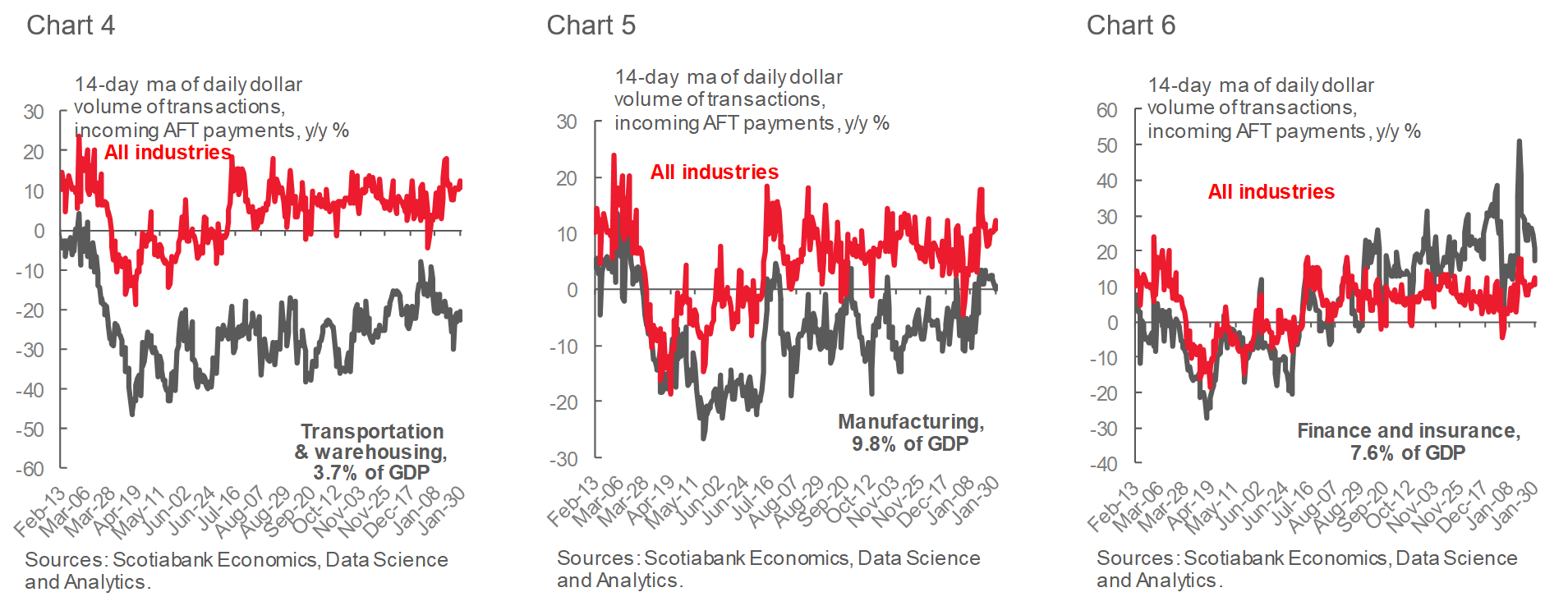 Growth in incoming payments picked up since mid-January, with a slowdown in retail flow being offset by a pickup in the wholesale, health and financial industries. The second half of January was also the first time when manufacturing firms saw incoming transactions consistently in line with last year’s levels, which is a sign of improving conditions in the industry. This follows a relatively strong December, when Canadian manufacturing sales rose +0.6% m/m according to preliminary estimates from Statistics Canada.
