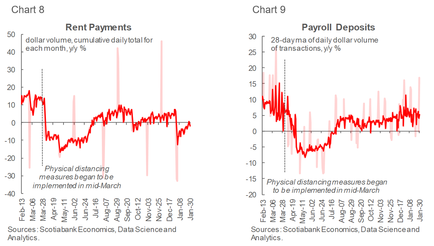 Cumulative monthly total for rent payments climbed to the level of a year ago, while payroll deposits remained relatively strong (Charts 8 and 9).