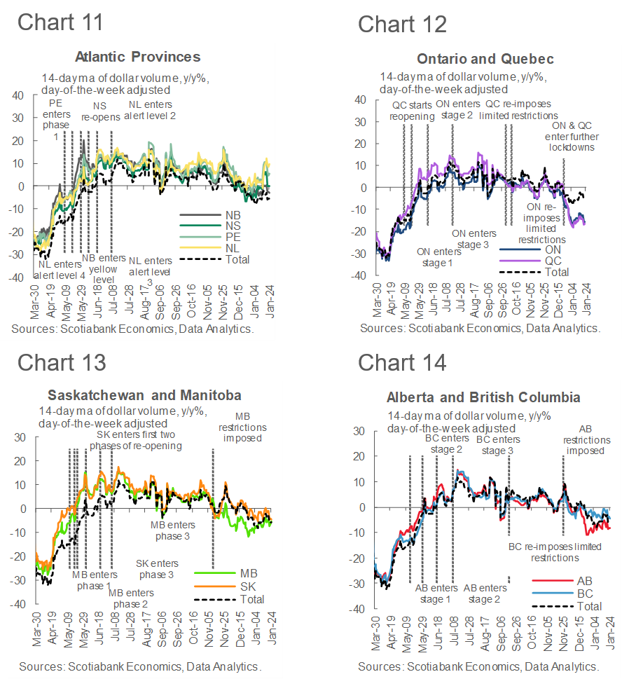 The dip in spending is seen across provinces, but Ontario, Quebec, and Alberta remain the weakest overall (Charts 11-14).