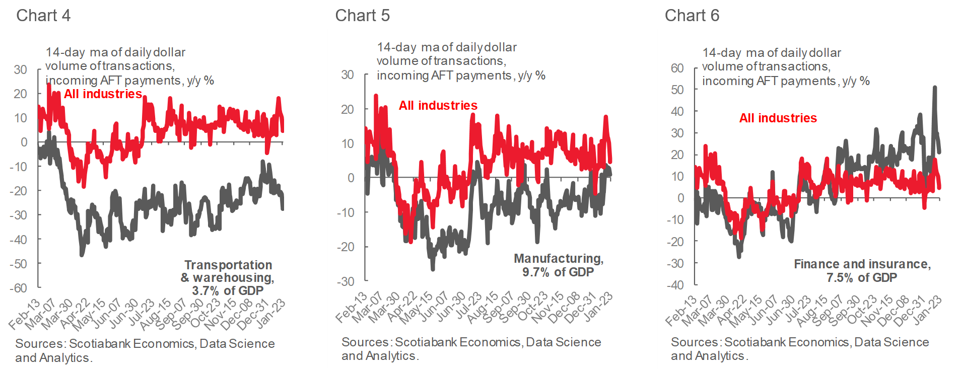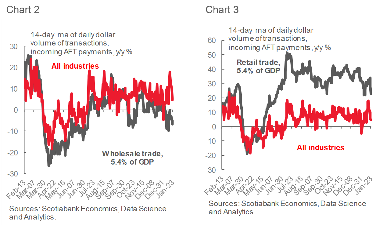 Updated to January 23rd, y/y growth in business sector transactions subsided after picking up last week (Chart 1).