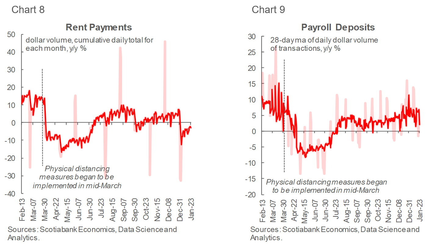 Payroll deposits, despite some volatility, continue to run above the levels seen a year ago. Rent totals have been gradually rising, with y/y growth only slightly negative over the past week (Charts 8 and 9).