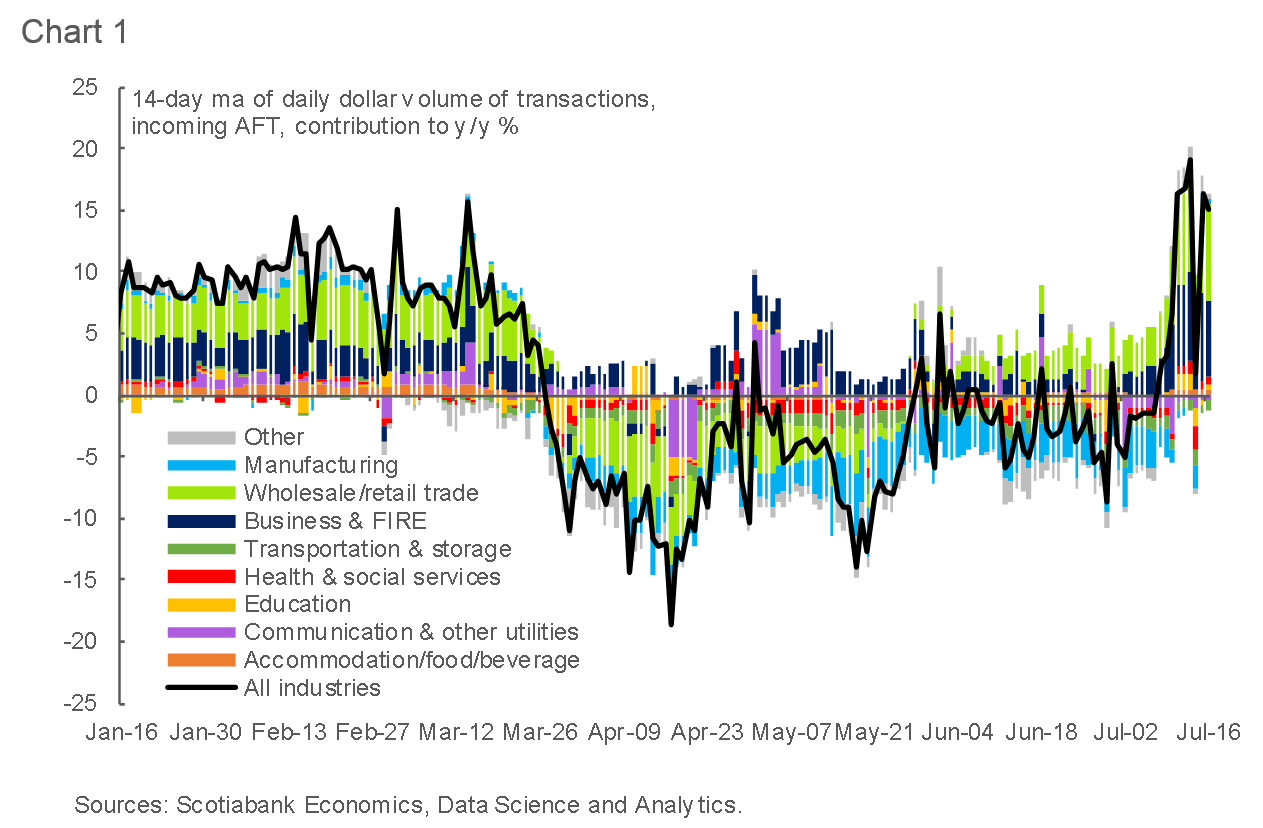-Both incoming and outgoing payments via automated funds transfer (AFT) were boosted by unusually high levels of miscellaneous payments occurring on July 10th. Nevertheless, once the unusual payments are excluded the overall volumes are still seen to surpass those of 2019.