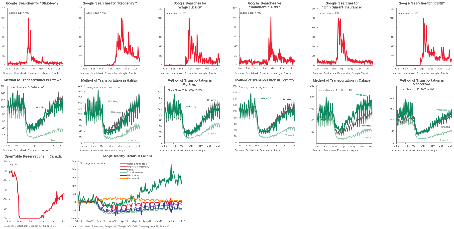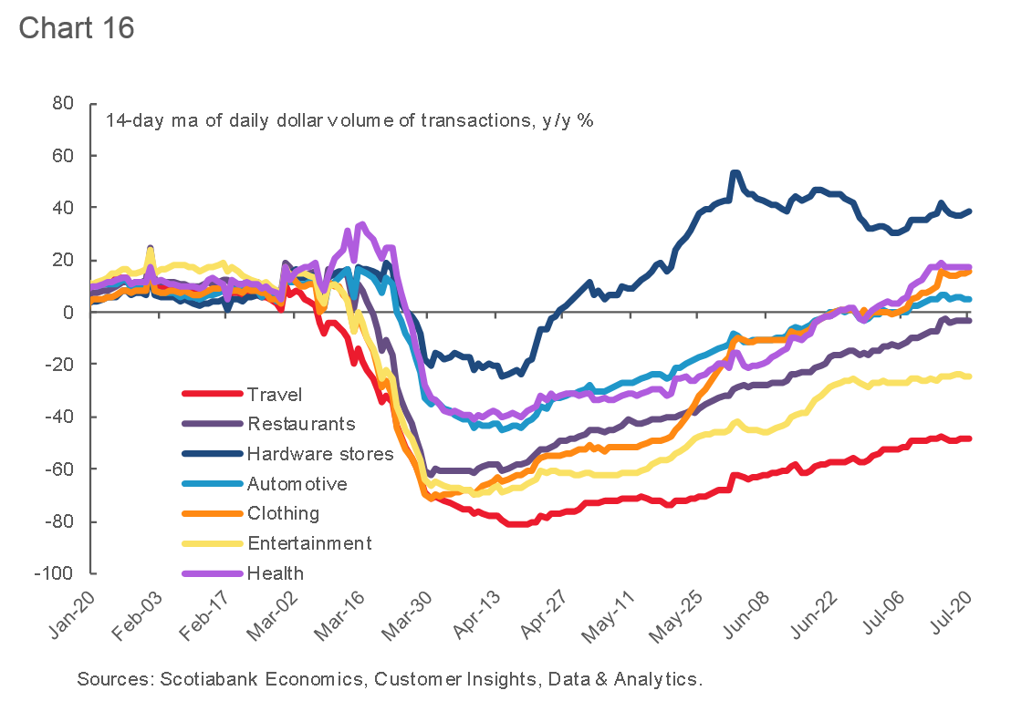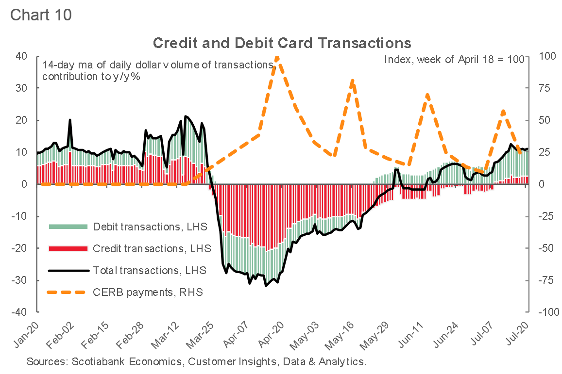 -Y/Y growth in credit card transactions has also turned positive since the beginning of July. - The amounts of CERB payments have been gradually coming down since reaching a peak in mid-April, in line with the observed improvement in the labour market in May-June.