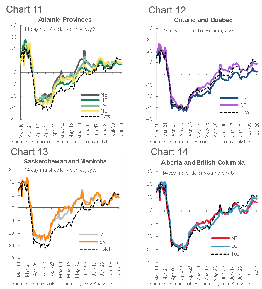 - The recent pickup in overall card spending can be seen across most provinces to a greater or lesser extent.