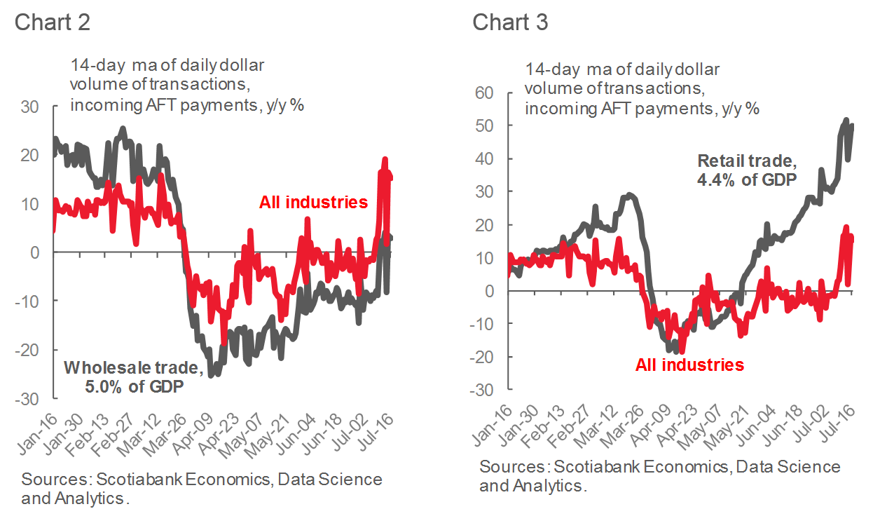 -To smooth out most of the day-to-day seasonality we use a 14-day moving average of the dollar volume of transactions, taking a y/y% change to remove any remaining seasonal patterns related to the calendar date. - In addition to seasonality, there is normal payment volatility related to the random nature of the transactions process and the impact of regional and economy-wide events (weather, labour strikes, etc.).