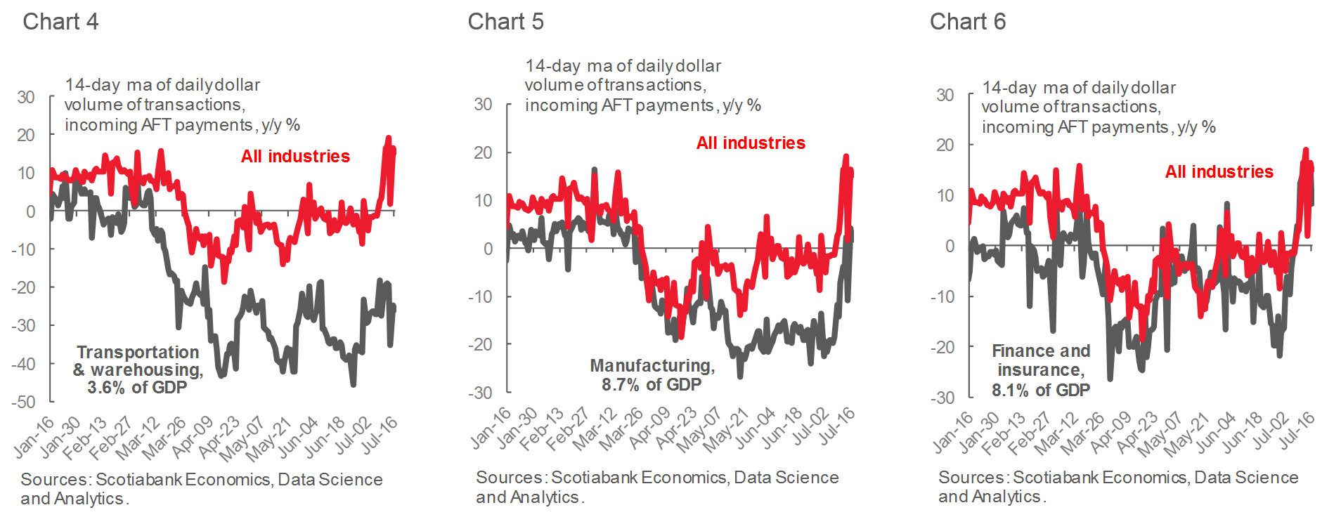 -Note that the mapping from the volume of transactions to measures of economic activity (e.g. GDP) is imperfect, and so care must be taken when drawing the implications. - The AFT payments show bill payments to/from companies in Canada.