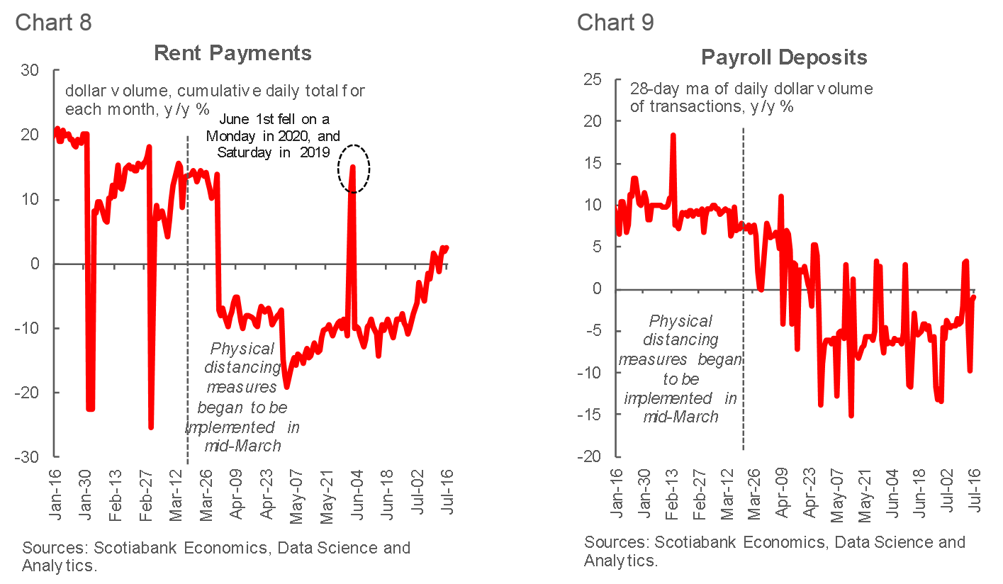 -Rent payments continued to rise, with y/y growth turning positive in mid-June. Payroll deposits have recently started to rise as well, in line with an improvement in the employment market (Charts 8 and 9).