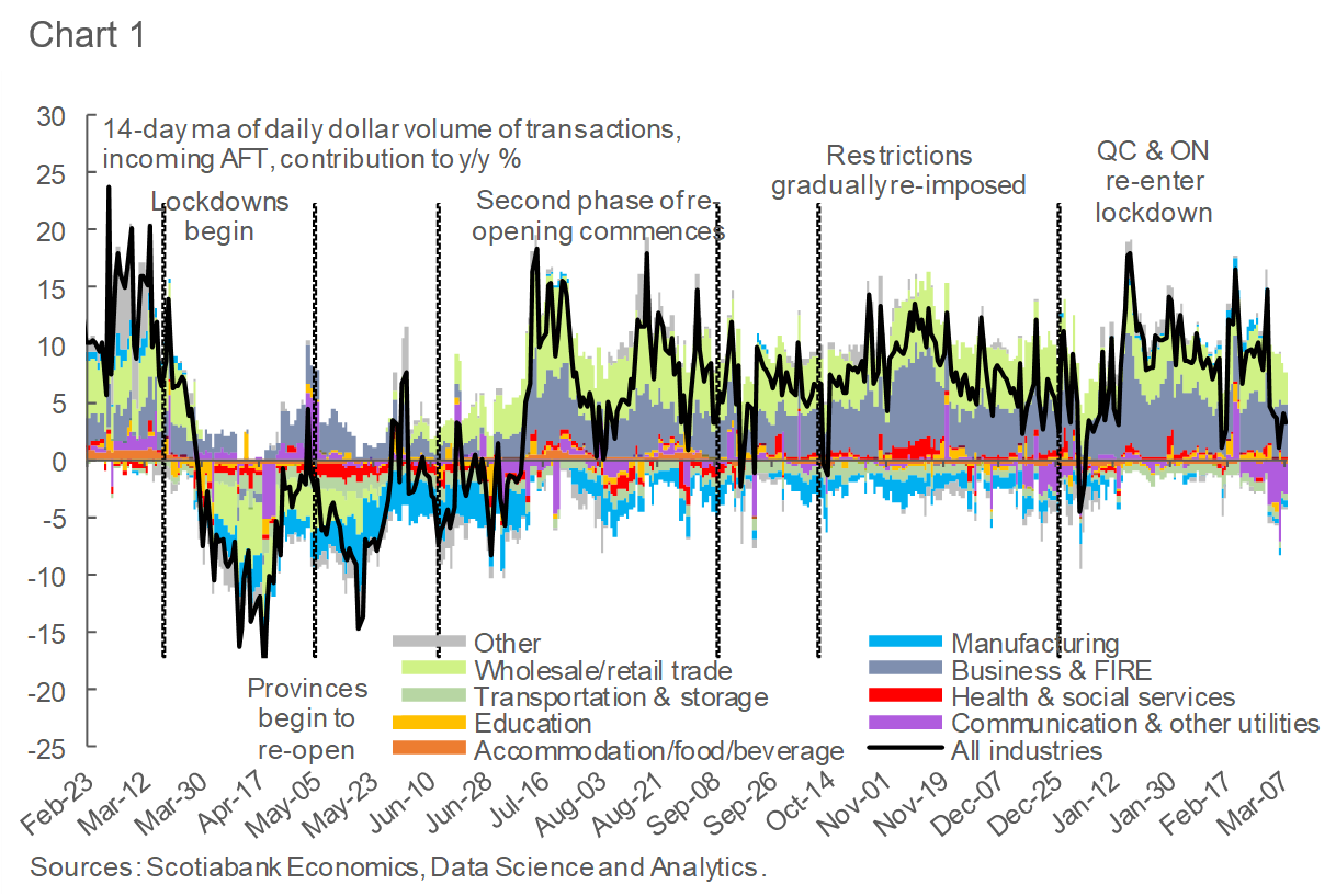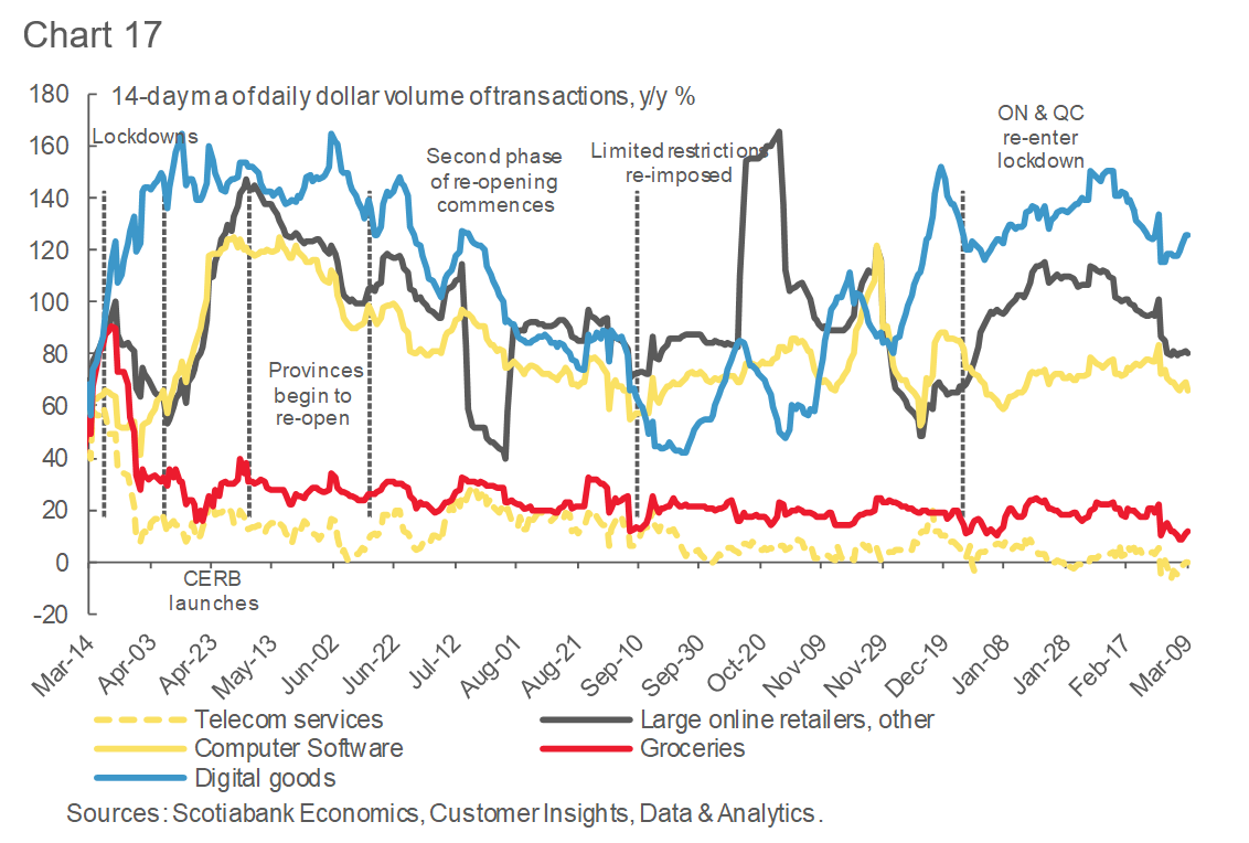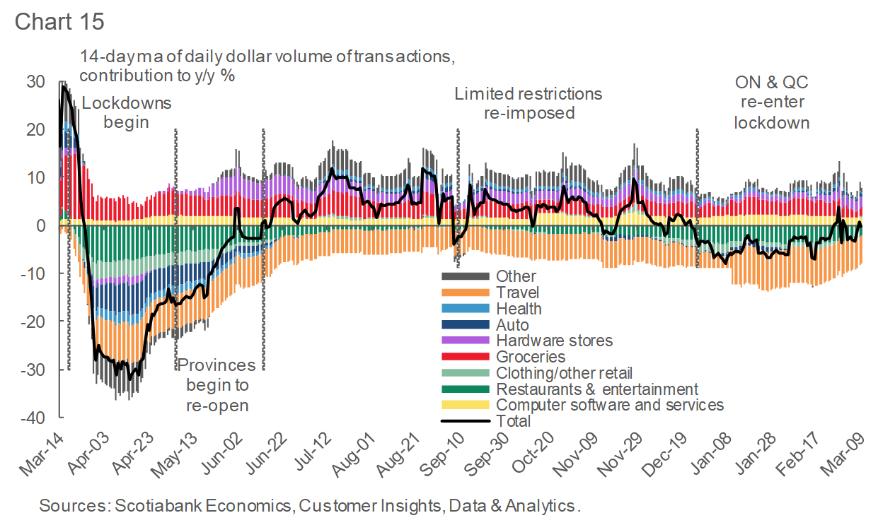 - Since mid-February, spending has improved the most in provinces that imposed the strictest lockdowns in late December and early January (Charts 11-14).